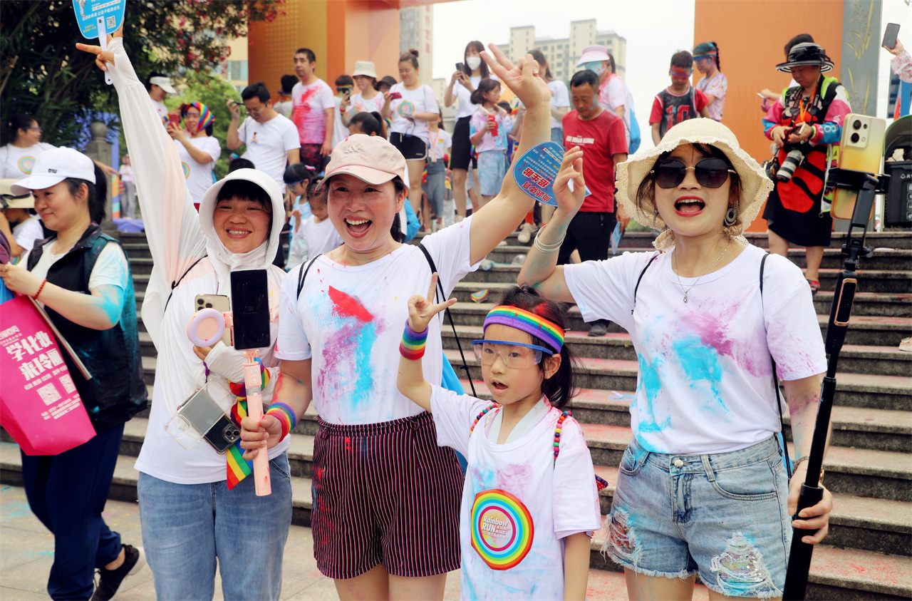 当天上午9时许,活动现场音乐劲爆、舞步欢快、色彩飞扬,身着主题文化衫、佩戴彩色方巾的参与者中既有活力四射的年轻人、精神矍铄的叔叔阿姨,也有活泼好动的小朋友。大家不分年龄性别,伴随着音浪尽情狂欢,或拍照留念,或互相抛撒彩粉,越“挂彩”越开心。