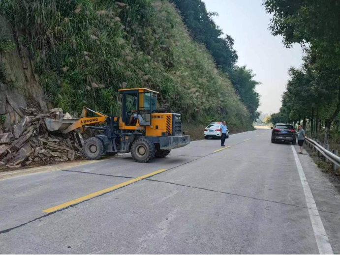 该中队立即启动应急预案,第一时间增派力量前往现场处置,并迅速通知县公路建养中心派出专业队伍赶赴塌方现场进行清理抢修。在塌方现场,工作人员密切协作,在设置安全警示标志牌,进行交通疏导、维持现场秩序的同时,采用“人工+机械”方式对路面塌方体进行紧急清运。