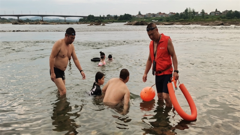 7月9日晚上7点左右,随着一场短时强降雨的结束,位于资水县城冬泳一基地水域又陆续来了不少市民前来游泳。陶建华和刘壮平两位值班人员佩带“跟屁虫”,手拿游泳棒等救生设备,在附近水域巡逻,提醒市民注意游泳安全。一位没带救生设备的市民带着孩子在不远处游泳,陶建华立即下河耐心劝阻,得到了这位市民的理解与支持。陶建华告诉记者,在日常巡逻与劝阻过程中,也遇到过有个别市民不听劝阻的情况。