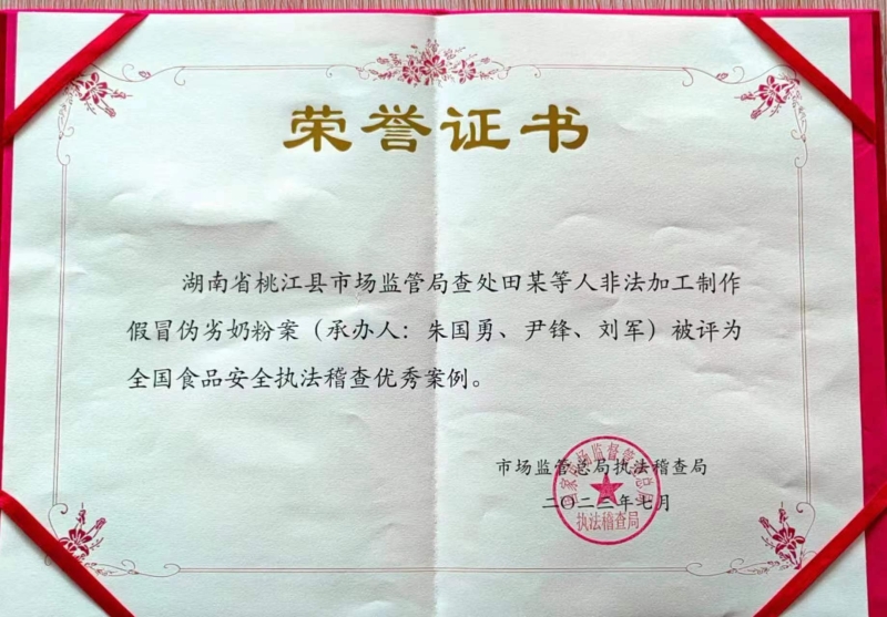 7月14日,从浙江嘉兴传来喜报,县市场监督管理局查办的“田某等人非法加工制作假冒伪劣奶粉案”,作为湖南省唯一参评案例,在当日国家市场监管总局组织的全国食品安全执法稽查优秀案例现场评审活动中,通过初评、现场评审、网络评选,一路过关斩将,总得分排名全国第4,成功获评“全国十大食品安全执法稽查优秀案例”。