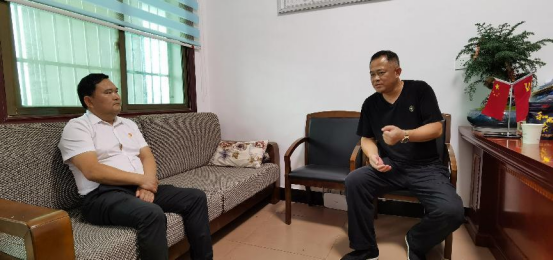 詹有良(右)与大栗港镇党委书记王锋交流 胡卫红 摄