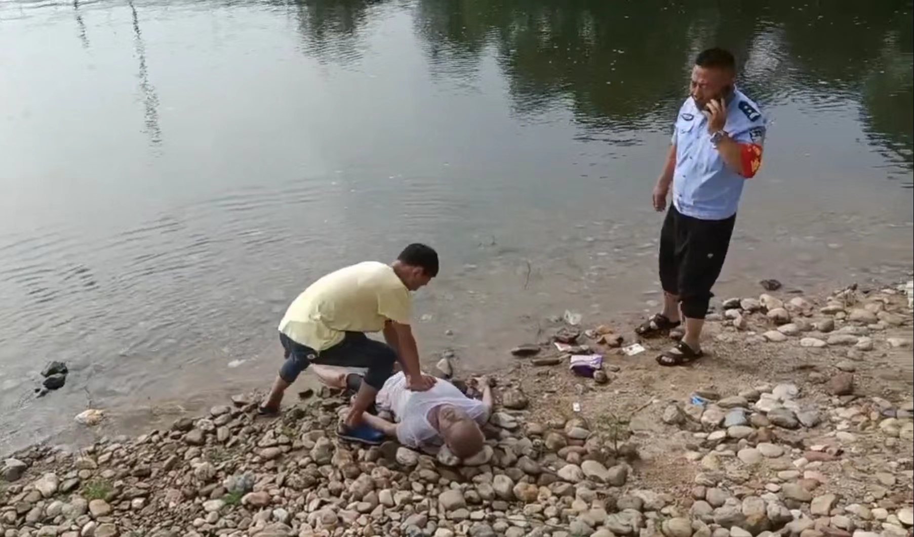 听到文科的呼喊声后,正在该基地开展防溺水流动巡查的桃花江镇杨家坳社区辅警刘胜国和保洁员刘龙庆立即跟着文科一道赶赴事发现场查看。只见离岸边10多米远的河中浮着一个人,于是3人立即跳进河中,一起将溺水者救到岸边。“看到溺水者一身发软,可能还有生命迹象,我和保洁员刘龙庆以及他(文科)轮流为溺水者做心肺复苏。”辅警刘胜国介绍。“在我给他做心肺复苏的时候,突然听到他‘啊、啊’了两声,我们觉得他有点反应了,就没有停下来。”保洁员刘龙庆补充道。
