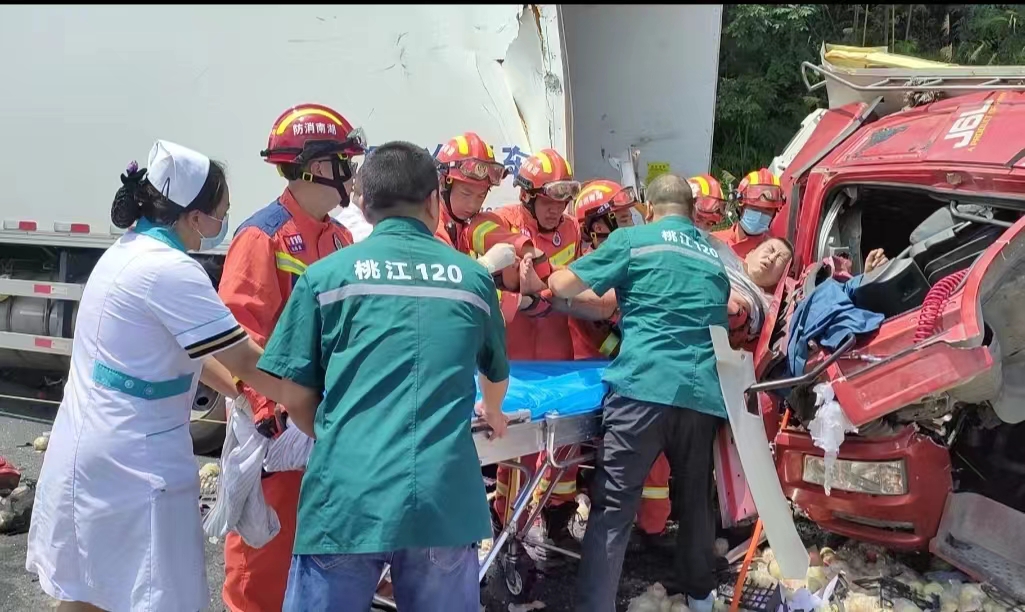 交警迅速对现场进行管制,消防救援人员用液压破拆工具对受困司机驾驶室进行破拆,并与司机取得沟通,缓解其焦虑紧张情绪,由现场医护人员查看伤情,进行初步治疗。经过消防救援人员的努力,上午11时30分,被困人员被成功救出,大家合力将被困司机从车内抬上担架,由救护车火速送往桃江县第三人民医院进行救治。经医生初步诊断,伤者为“右腿胫骨平台骨折+腓骨头粉碎性骨折+韧带损伤”。