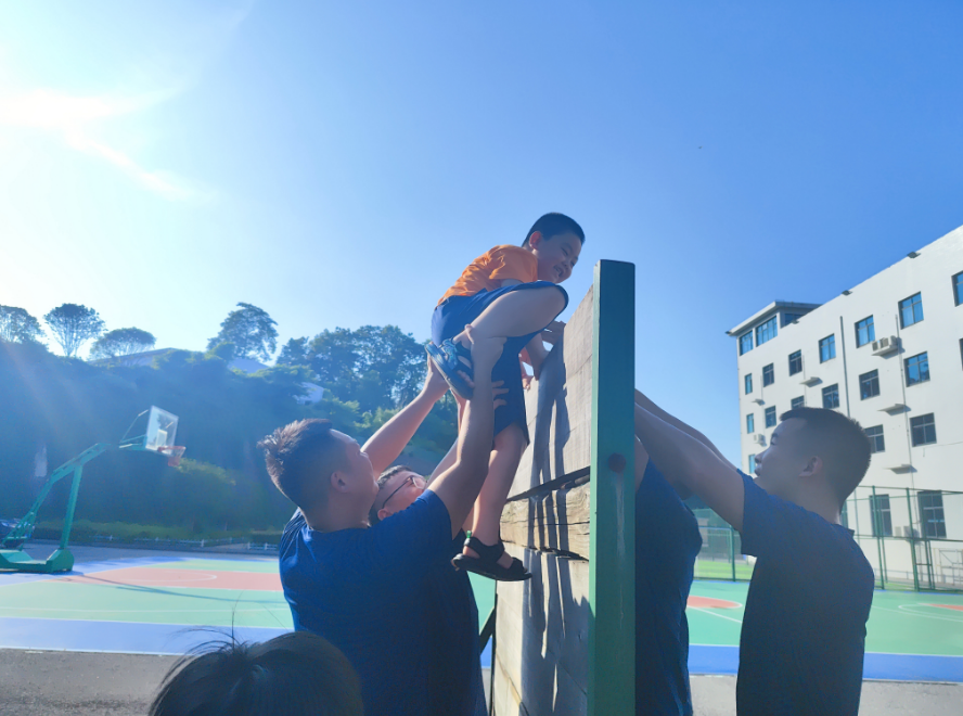 孩子们在消防队员的保护下体验独木桥项目 陈思颖 摄