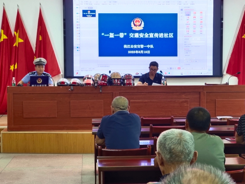 8月18日上午,桃江县公安局交通警察大队一中队民警走进桃花江镇半稼洲社区开展“一盔一带”交通安全宣传进社区活动。