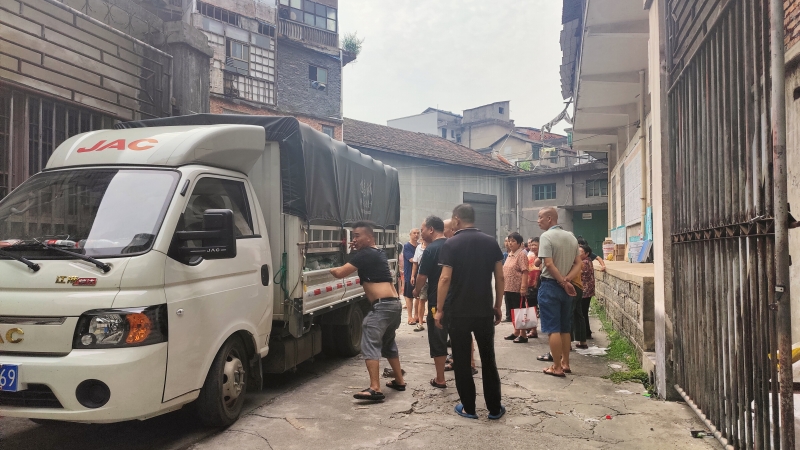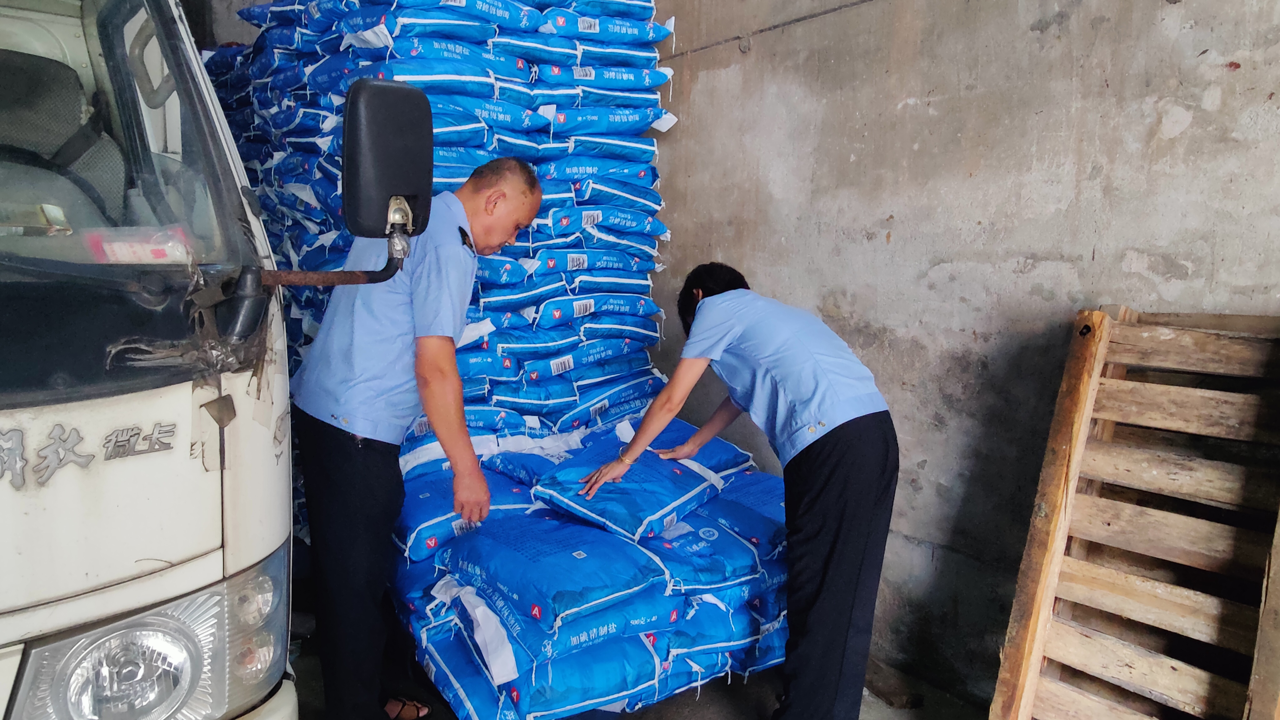 图为工作人员将食用盐装车运往县城各大超市 徐珊 摄
