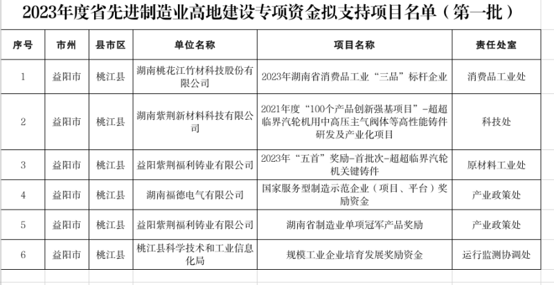 近日,湖南省工业和信息化厅、湖南省财政厅公布2023年度省先进制造业高地建设专项资金拟支持项目(第一批),福德电气、紫荆铸业、竹材科技等企业共六个项目入选,为桃江勇攀先进制造业高地再添新动能。