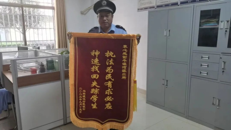 9月17日,桃花江镇牛潭河社区居民肖某将一面印有“执法为民有求必应 神速找回失踪学生”的锦旗送至当地派出所民警手中,感谢他们找回了赌气离家出走的儿子。