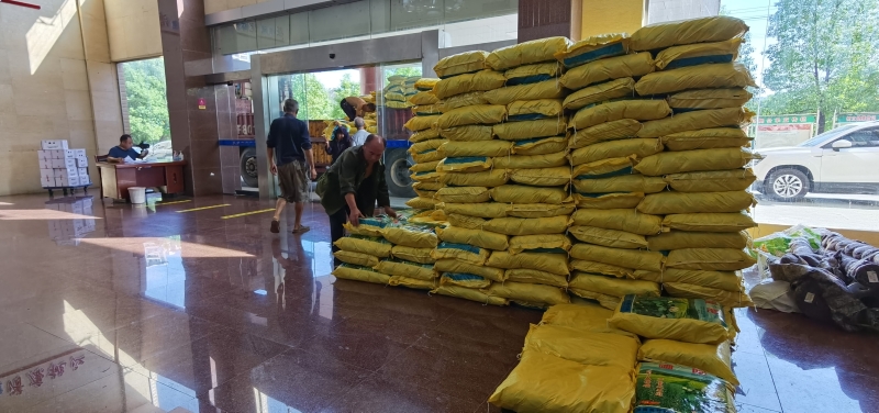 农民工正在将油菜种子卸车到县农业农村局一楼大厅 胡卫红 摄