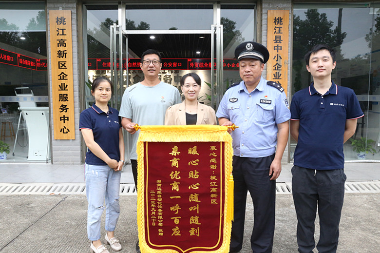 9月20日,桃江高新区一企业负责人将印有“暖心贴心随叫随到 亲商优商一呼百应”16个大字的锦旗送到园区企业服务中心工作人员手中,感谢园区管委会和当地派出所为其追回1000余元加工费。