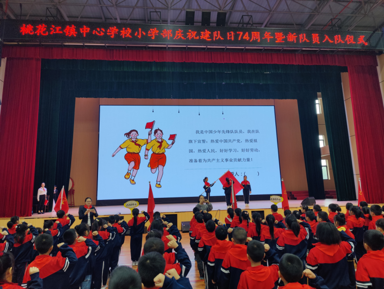 2023年10月13日上午,桃花江镇中心学校小学部举办庆祝少先队建队74周年暨新队员入队仪式。