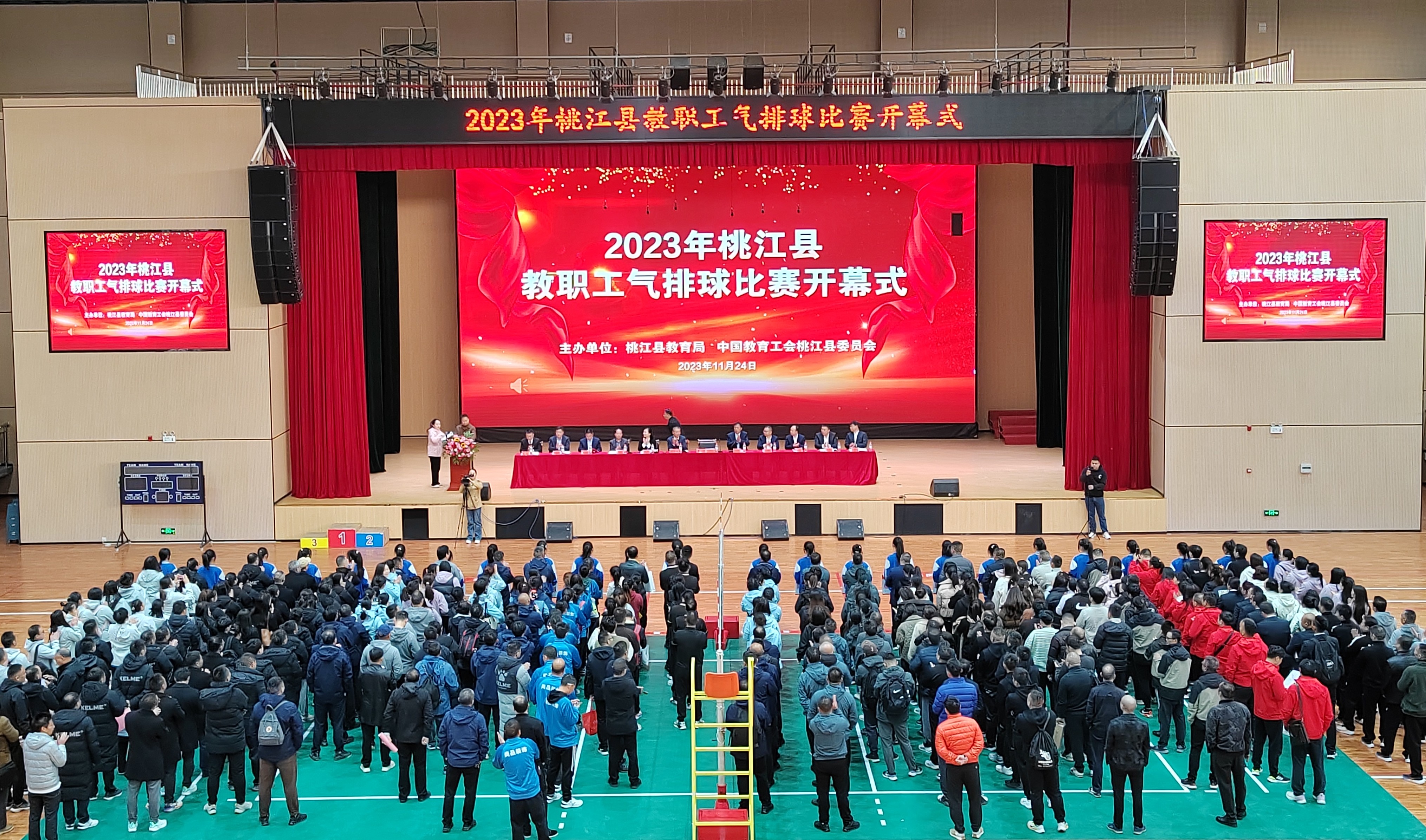 11月24日上午,2023年桃江县教育系统教职工气排球比赛开幕式在桃花江镇中心学校体育馆举行,来自全县教育系统的23支队伍,以及裁判员、教练员等共计388人参加。