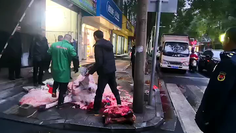 当天下午6点钟,县城管执法局在巡查至花桥路某段时,发现某牛肉店门前放置着一头已被屠宰的牛,人行道上满地鲜红的牛血,屠户正当街对屠宰的牛进行剖解,场面十分血腥。老板张某在街边用水管冲洗刚掏出的牛内脏,血水在马路边横流,引起一些市民围观,严重影响了交通和市容,对此情况,执法人员立即予以劝阻和制止。