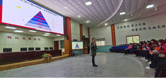 授课现场,高级心理咨询师、来自桃江县悦慧社会工作发展中心的卢媛老师以“人生六层次规画”为主题,为该校高一、高二的近300名学生讲述了使命、身份、信念价值观、能力、行为、环境“六层次规画”,再通过毛主席、周总理等老一辈无产阶级革命家从小立志的故事,激发学生的内在动力,引导学生开始思考“我将要成为一个怎样的人?”“我可以为这世界创造怎样的价值?”让学生相信,可以在有限的生命体验中,活出无限的可能性,相信自己,并持续去做到,就可以创造奇迹。