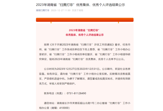 12月17日,省“扫黄打非”办公室公布2023年全省“扫黄打非”优秀集体、优秀个人评审结果,桃江县委宣传部榜上有名,获评湖南省“扫黄打非”先进集体称号。