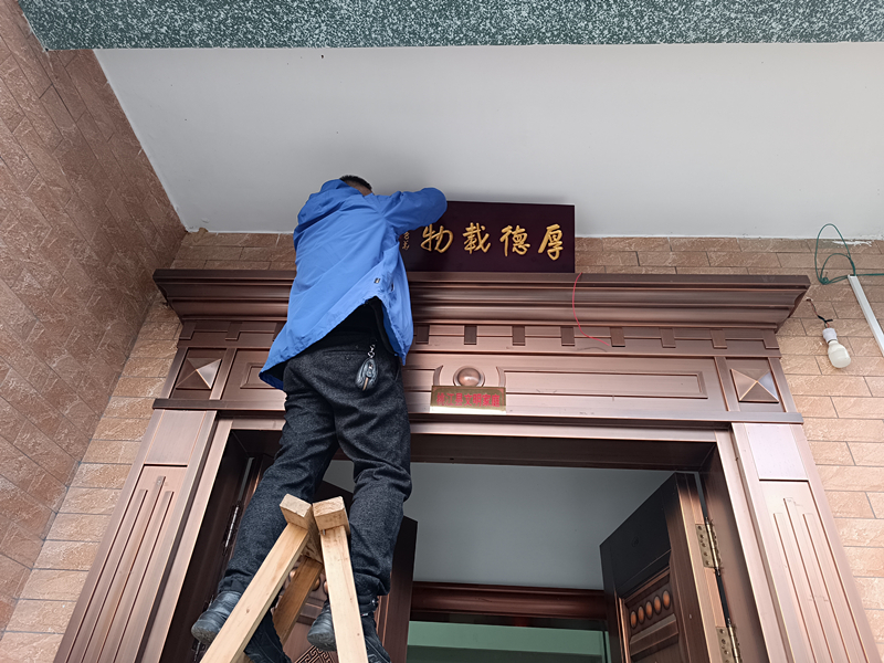 不远处,该村党总支书记文建华正带领村干部挨家挨户挂金匾。这一批匾额是由桃江县书法家协会组织桃江一些知名的书法家书写的,制作成精美的鎏金匾额后,分发给本村村民挂在各家的门楣上。“挂上金匾后,屋里的大门更加气派了,文化品位也提高了,新年又有了新气象。”正在旁边围观的村民开心地说道。