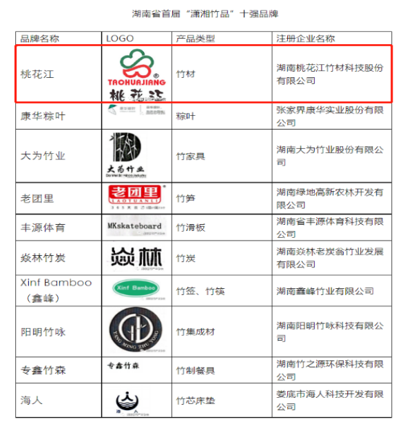 近日,湖南省竹产业协会公布了湖南省首届“潇湘竹品”十强品牌名单,湖南桃花江竹材科技股份有限公司注册的品牌“桃花江”榜上有名。