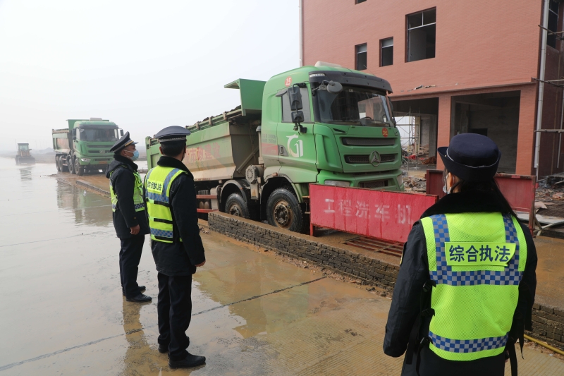 城管执法人员在管控城区渣土车的降尘工作 陈明 摄