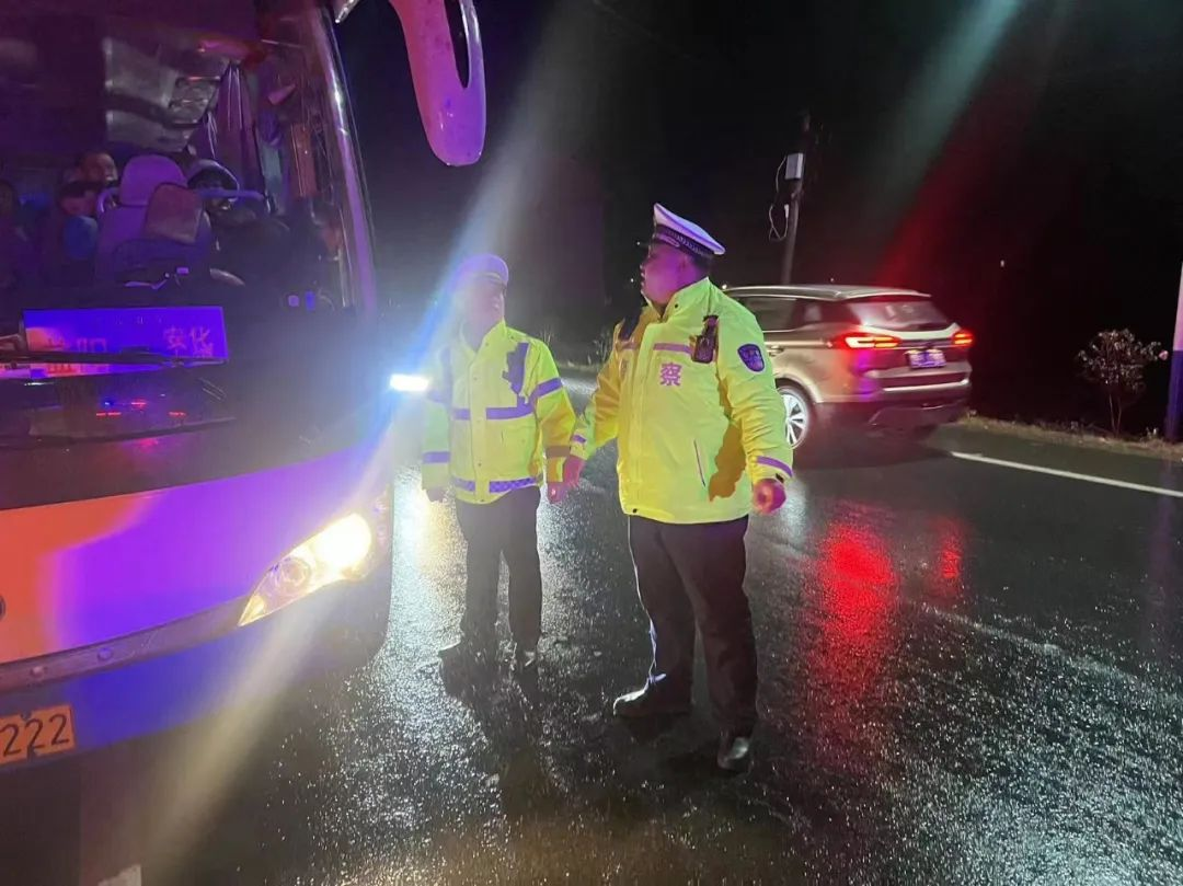 2月2日晚上7时30分许,执勤交警在国道536线紫金湾春运检查站拦停了一台装载50多名乘客去往安化的大巴,经请示上级公安交管部门,由桃江交警大队安排警车压速牵引,市交警支队指挥中心同步调度安化交警大队接续牵引车辆返回安化。当牵引警车行驶到国道536线马迹塘镇路段时,又及时劝返一台由安化方向驶来的大巴车。当晚21时30许,两台大巴车均安全交由安化交警大队继续牵引护送。