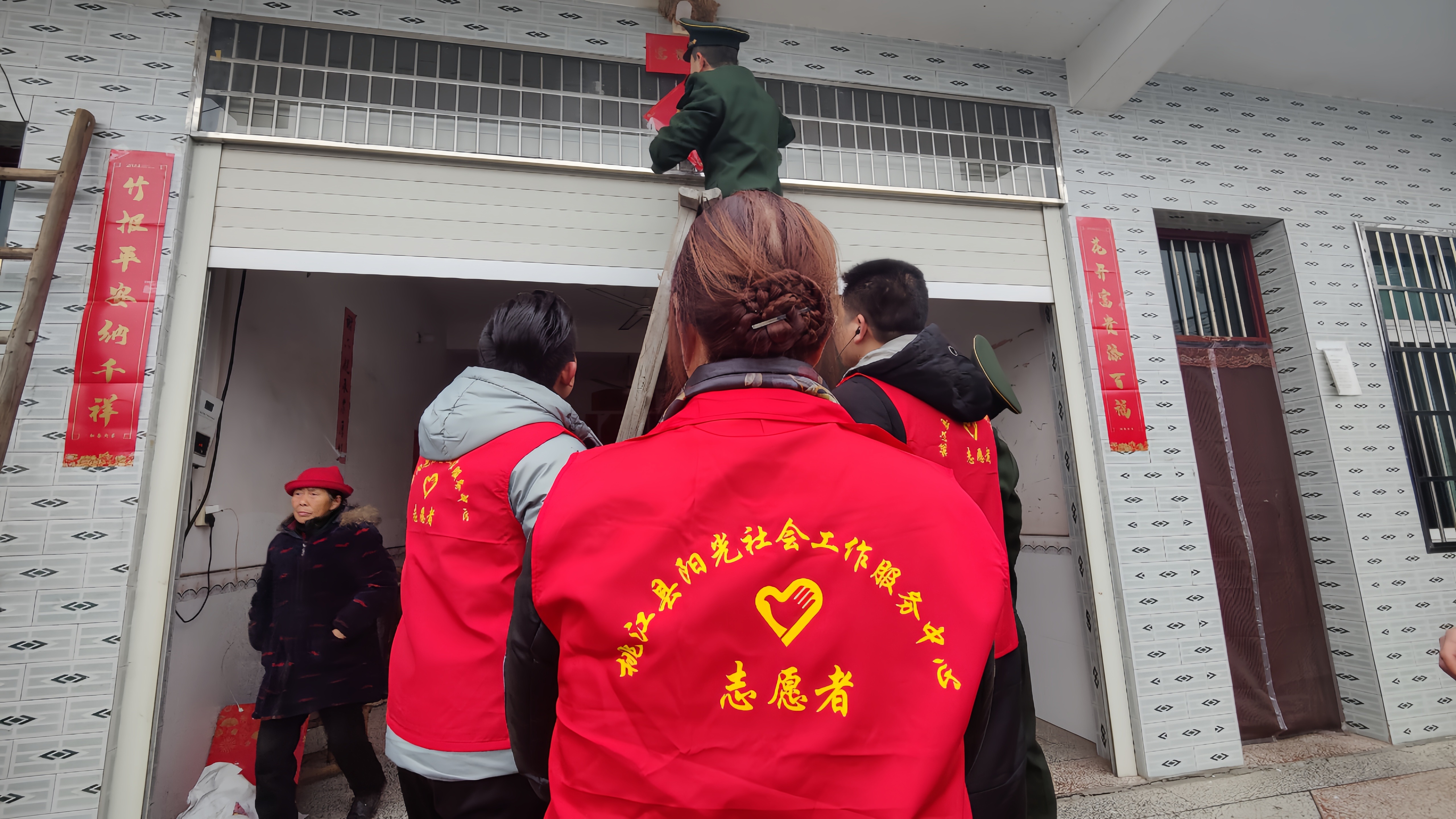 志愿者为烈士家属张贴春联 肖正秋 摄