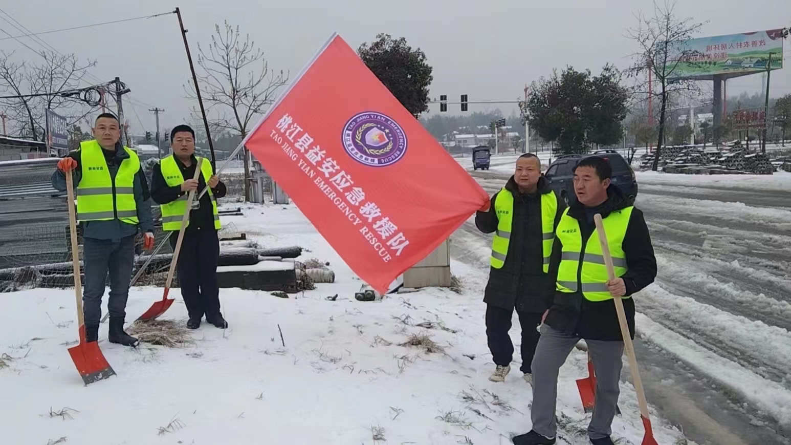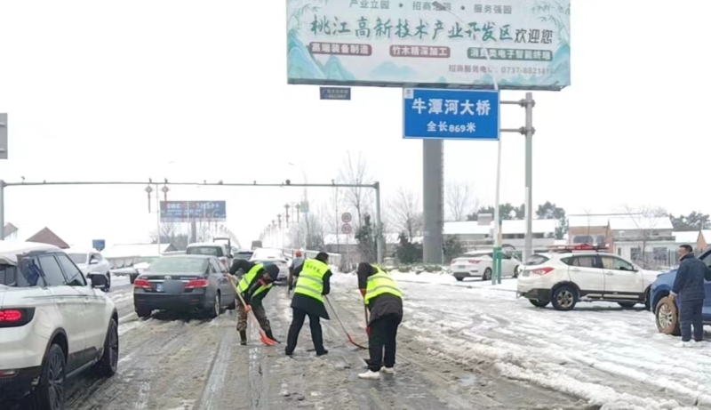 2月4日早上的桃江,县城范围内各交通要道、乡村公路被冻雪覆盖。桃江县益安应急救援队积极出动,号召15 位志愿者参与扫雪除冰,自发出动多台四驱越野车帮助拉动遇到困难的车辆。救援队分别在桃马线杨家坳红绿灯与浮邱山大道交界处、牛潭河大桥、花桥路口与雪峰山路口交界处、十字街路口参与铲雪活动。