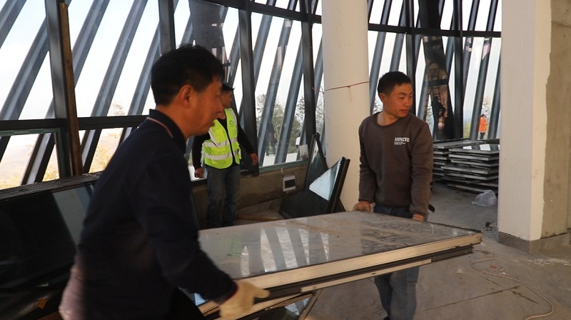 工人正在为景观塔搭建玻璃幕墙 李丹 摄