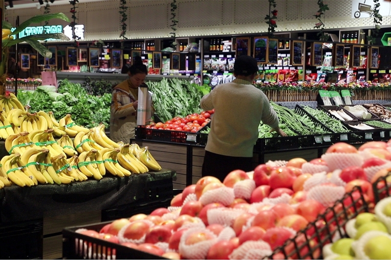 2月20日,在中润联华超市,记者看到生鲜区内各种新鲜蔬菜摆满货架,猪肉价格与往日基本持平,市民们正有序购买生活必需品。