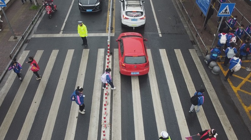 城管执法人员与学生家长共同守护孩子们安全穿越马路 罗寒 摄