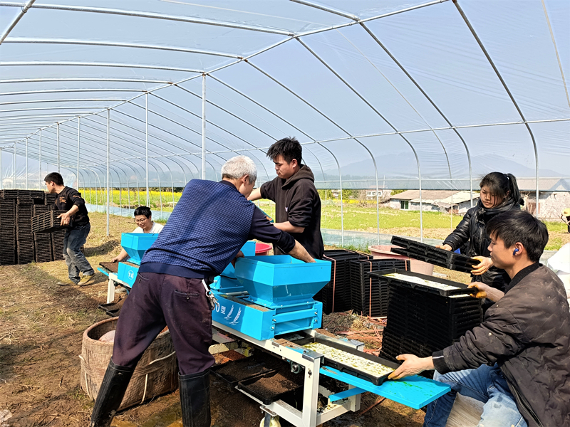 在育秧播种机机尾接育秧盘的龚小勋是桃花江镇栗树咀村的村民,出生于1980年的他,虽然跟张超不属于同一个镇,却是相邻而居,这些天他一直在高桥镇这边帮忙播种育秧。
