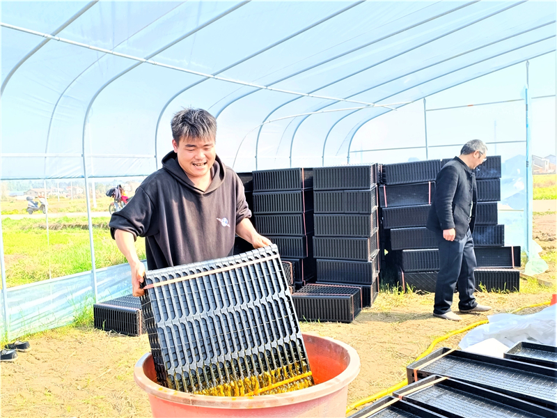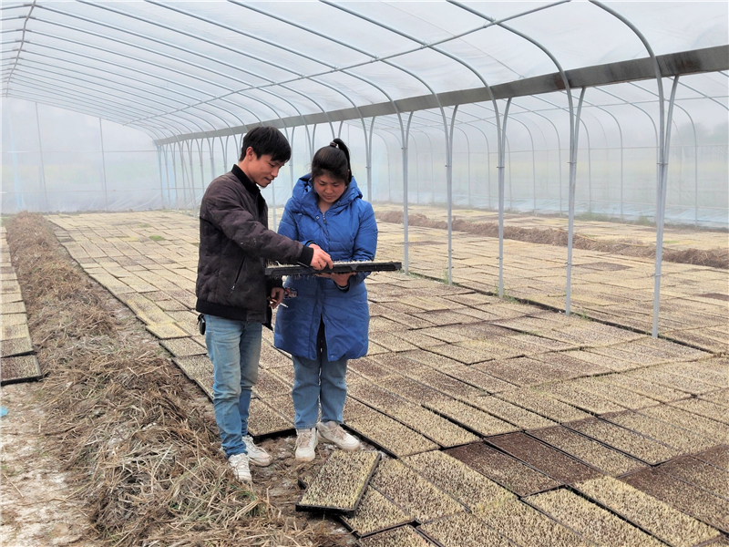 张超、张柳夫妇在自家育秧大棚里察看早稻种子发芽情况 袁静 摄