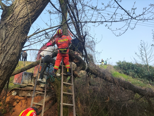 3月19日16时12分,桃江县消防救援大队指挥中心接到群众报警称,沾溪镇贺家坪村一八旬老人上树砍柴,因体力不支被困树上,请求救援。听到电话端报警人慌乱的声音,接警人员让报警人安抚被困人员的情绪,并立即调度桃江高新区消防救援站赶赴现场救援。