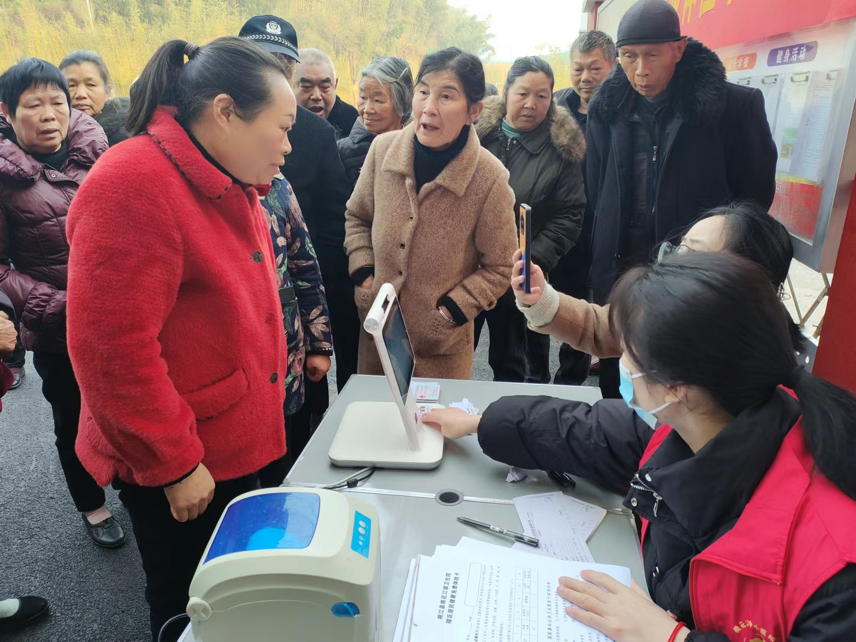 前来体检的张大爷一边体检一边激动地说:“现在国家的政策越来越好了,医生一早就过来对我们的身体状况进行全面检查,还耐心告诉我们应该怎么注意身体,非常认真负责。忙活了一上午,他们真的辛苦了!”