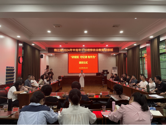 4月22日,桃江县2024年中青年干部理想信念教育研修班开展“讲规矩、守纪律、有作为”演讲比赛,15名学员参加比赛。