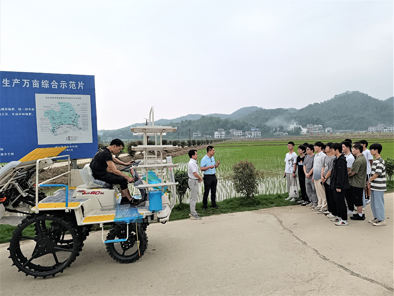 在修山镇三官桥村高标准农田示范区的田边,湖大学子们参观了智慧农业设施,观摩了高速插秧机、植保无人机、耕田机的演示。大队长农业公司总经理高贵向同学们介绍了他们公司在数字化农业、乡村振兴等方面的痛点和堵点。