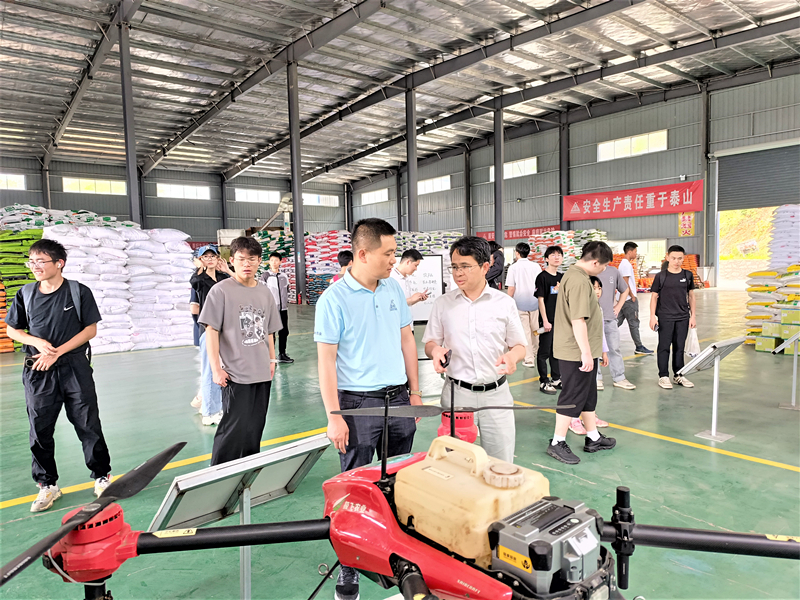 荣辉桂副教授(前右一)带领学生参观湖南大队长农业有限公司的无人机及互联网设施 袁静 摄