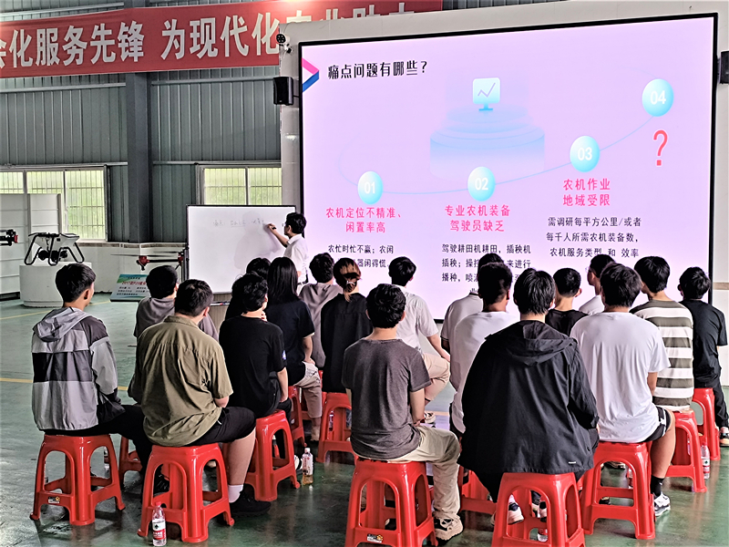 随后,大家走进大队长农业公司修山基地仓库,参观该公司的新型农机器具、大疆无人机、互联网设施等,并进行《2024“互联网+”双创课堂——如何发现商业机会?》的教学。在分组讨论阶段,同学们结合大队长农业公司面临的痛点、堵点问题,运用他们掌握的商业知识,探讨为公司寻找新的商业需求和创新项目。
