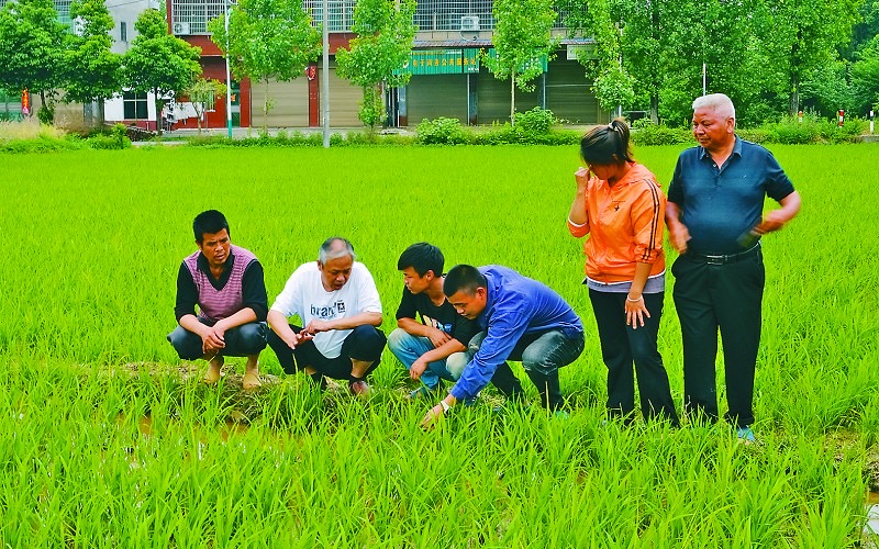 走进荷叶塘村,一大群人围着眼前的地块,根据禾苗的长势以及病虫害遭受程度发表自己的意见,争论声很激烈,场面却十分和谐。这群人中,有“00后”小伙子胡豪,“90后”夫妻张超张柳,有“70后”“80后”种粮大户胡国秋、邱春西,还有镇农技专家姜立新。