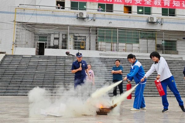 随着尖锐的警报声响起,演练拉开序幕。在各班班主任的组织下,学生们一手护头,一手遮掩口鼻,低首弯腰,沿着应急预案指定的路线快速跑向安全区域。随后,大队宣传员围绕校园火灾特点和危害,用通俗易懂的语言向师生讲述校园消防安全、怎样发现和消除身边的火灾隐患、如何正确拨打119报警电话及如何逃生自救方法等知识,重点叮嘱日常生活中如何安全用火用电用气,避免火灾的发生。活动最后,消防救援人员现场讲解演示灭火器的正确使用方法,模拟了简单的火灾事故现场,并挑选了部分教职工和学生现场“灭火”,他们迅速反应,举起灭火器,拔掉安全栓,对准火源根部进行喷射,近距离体验了消防灭火的过程。