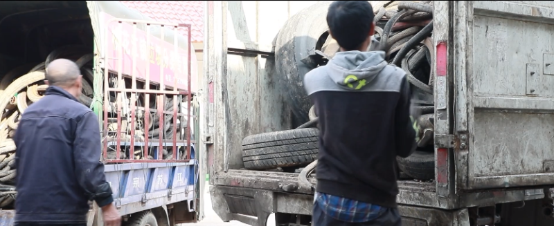 村民将废旧轮胎装车送往分拣中心 丁亮 摄