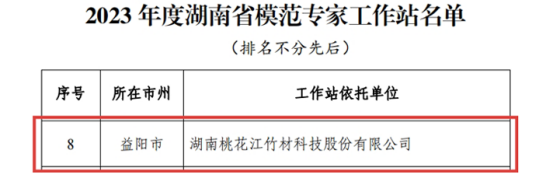 近日,湖南省科学技术协会公布2023年度湖南省模范专家工作站名单,湖南桃花江竹材科技股份有限公司(以下简称桃花江竹材科技)等10家企业被评为“湖南省模范专家工作站”。