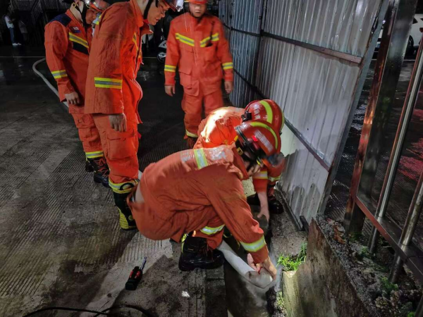 21时07分,消防救援力量到达现场。经现场指挥员勘查发现,该处是一栋独立民房,地势较低,是三个小区排水管汇集处,且因天降暴雨,加上排水不畅,导致水位不断上涨。眼看积水就要漫进群众家中,情况紧急,指挥员立即组织铺设1条排水线路进行排水,并通过使用机动泵不间断开展排涝作业,险情得到成功处置,共计排水80吨。23时22分。救援人员安全归队。
