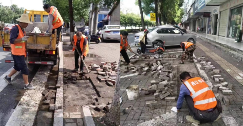 维护前,工作人员对市政设施水毁情况进行了全面的摸排,根据摸排结果“量身定制”维修计划。随后,工作人员重点对损坏的人行道砖板、雨水井座、树围石等进行了修复。