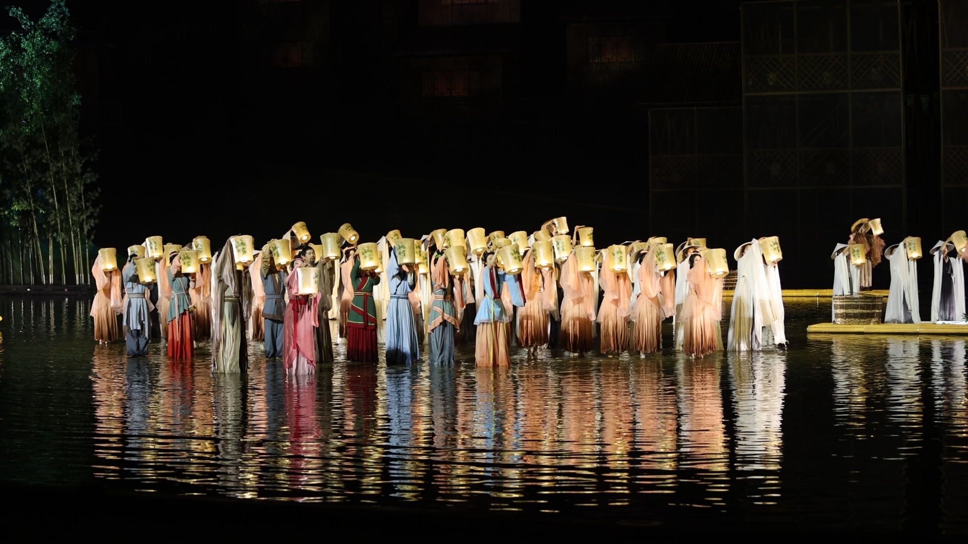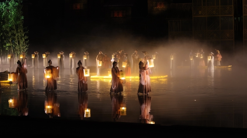 据悉,为确保演出呈现出最好的效果,剧组搭建了水舞台、大剧场以及曲水流觞、竹村等11个微剧场,通过数字艺术进行有机改造,在原有的剧场之上“借景还境”。充分利用水月数控装置、裸眼全息影像技术、潜藏式水景舞台矩阵、流动式车台、可移动数控餐桌等多项专利研发的数字机械化科技技术,实现数字化控制与艺术化呈现的创新融合,使演出空间不再拘泥于台上,而是天空、竹海、头顶、桌面、眼前互为联动。从而实现一个真正360度沉浸的幻境场域。据了解,该剧场投影机数量高达182台。