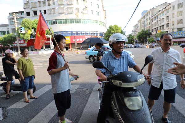 宣讲活动结束后,2303班的学生代表向坚守在高温一线的执勤交警进行了慰问,并为他们心目中“最可爱的人”送上了防暑物资。在随后的队列训练和交通手势指挥操学习环节,40名学生在教官的引领下认真操练。尽管因天气炎热汗流浃背,但孩子们毅然坚持,现场氛围既严肃又活泼。随后,80余名学生和家长分成4组,在执勤交警的带领下来到县城金凤路口,通过提醒车辆和行人遵守交通信号灯、劝导摩托车和电动自行车驾乘人员佩戴安全头盔、向路人发放宣传资料等方式,共同参与交通安全文明劝导活动。