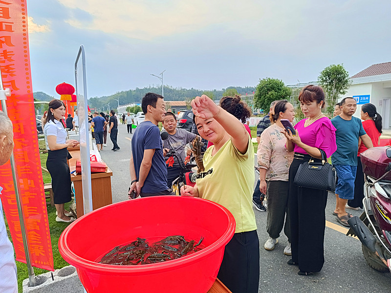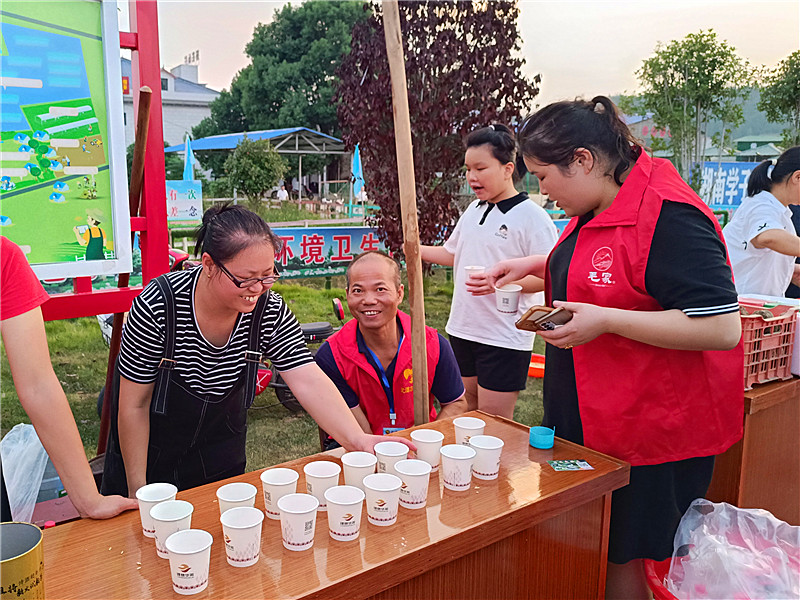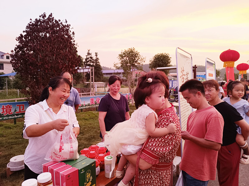 晚会现场,喜获丰收的农民朋友带来了蔬菜、茶叶、竹笋、葡萄、米醋等系列特色优质农产品进行售卖,莲花坪村村民向参加活动的来宾展示了磨豆浆、打糍粑、擂擂茶、煮武潭鱼等当地传统民俗。