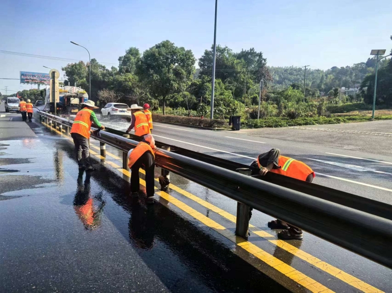 工作人员对道路护栏进行清洗 罗寒 摄