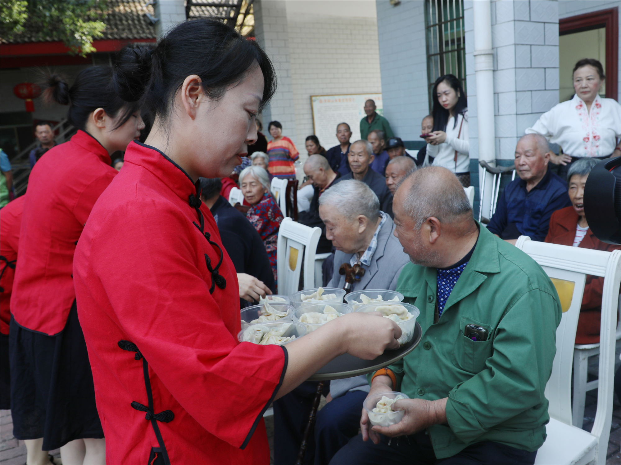 志愿者把煮熟的饺子端到老人手中 张红莉 摄