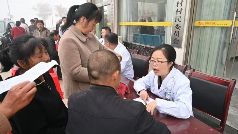 在马迹塘镇九岗山村村委,当地群众早早来到这里等候,义诊现场热闹非凡。村民在当地志愿者的引导下,排队问诊。医疗队员耐心细致地为群众提供健康宣教、疾病筛查、诊断、治疗等服务,现场还为群众发放健康宣传资料和免费药品。