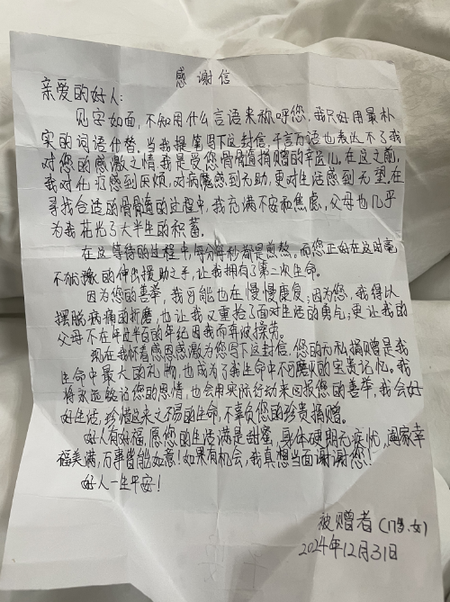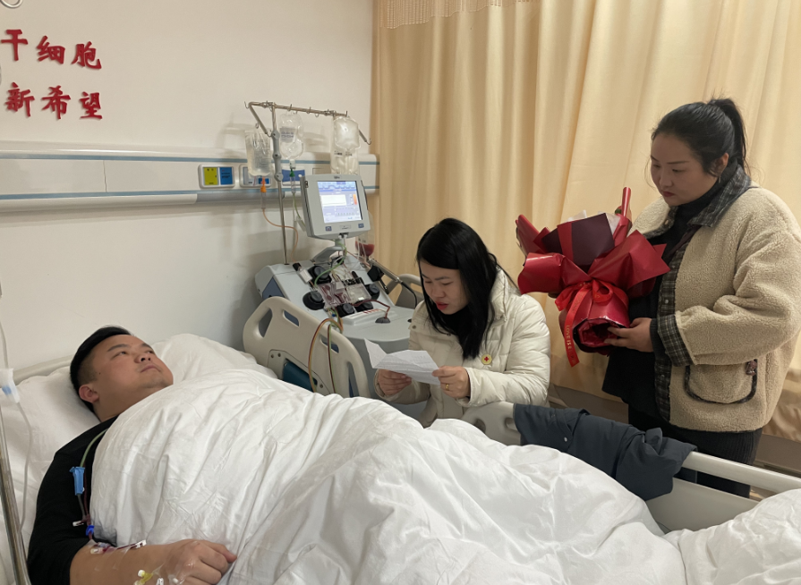 上午10点,记者在湘雅医院的骨髓/造血干细胞移植31病室,见到了正在采集造血干细胞的高啸。省、县红十字会的相关人员为他及家人献上了捐献证书和鲜花,还为他带来了受助者的感谢信。