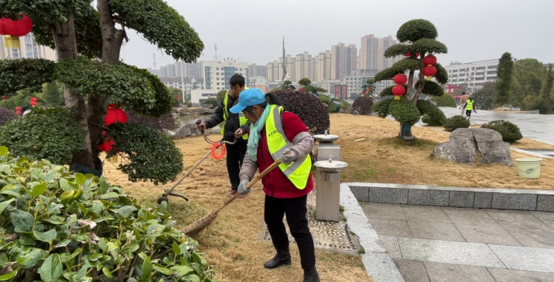 春节期间,桃江园林工人坚守工作岗位,精细呵护着城市的一草一木,扮靓城市景观。
